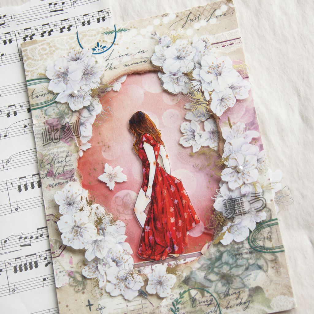 有位女孩常來逛市集說她最愛梅花,今年剛好寒流夠冷梅花怒放, 我很快樂的去賞了好幾次,再用畫筆把映上藍天與陽光的梅花, 用水彩一層一層的畫出美好,並搭配鏤空立體燙金,真的超美!